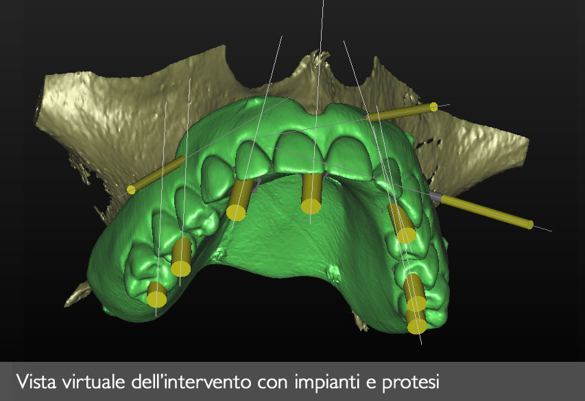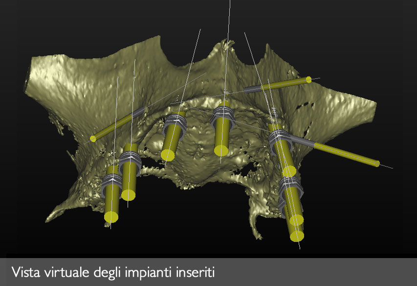 A questo punto il chirurgo odontoiatra con l’ausilio di un programma specifico, potrà simulare tutto l’intervento al PC, evidenziando in anticipo tutte le eventuali difficoltà anatomiche e calcolando numero, diametro, lunghezza e direzione degli impianti ideali per quello specifico paziente. Successivamente sarà possibile realizzare un incontro in cui il paziente potrà vedere sul computer la simulazione del suo intervento e decidere, secondo le sue esigenze, quando fissare l’appuntamento per la chirurgia.